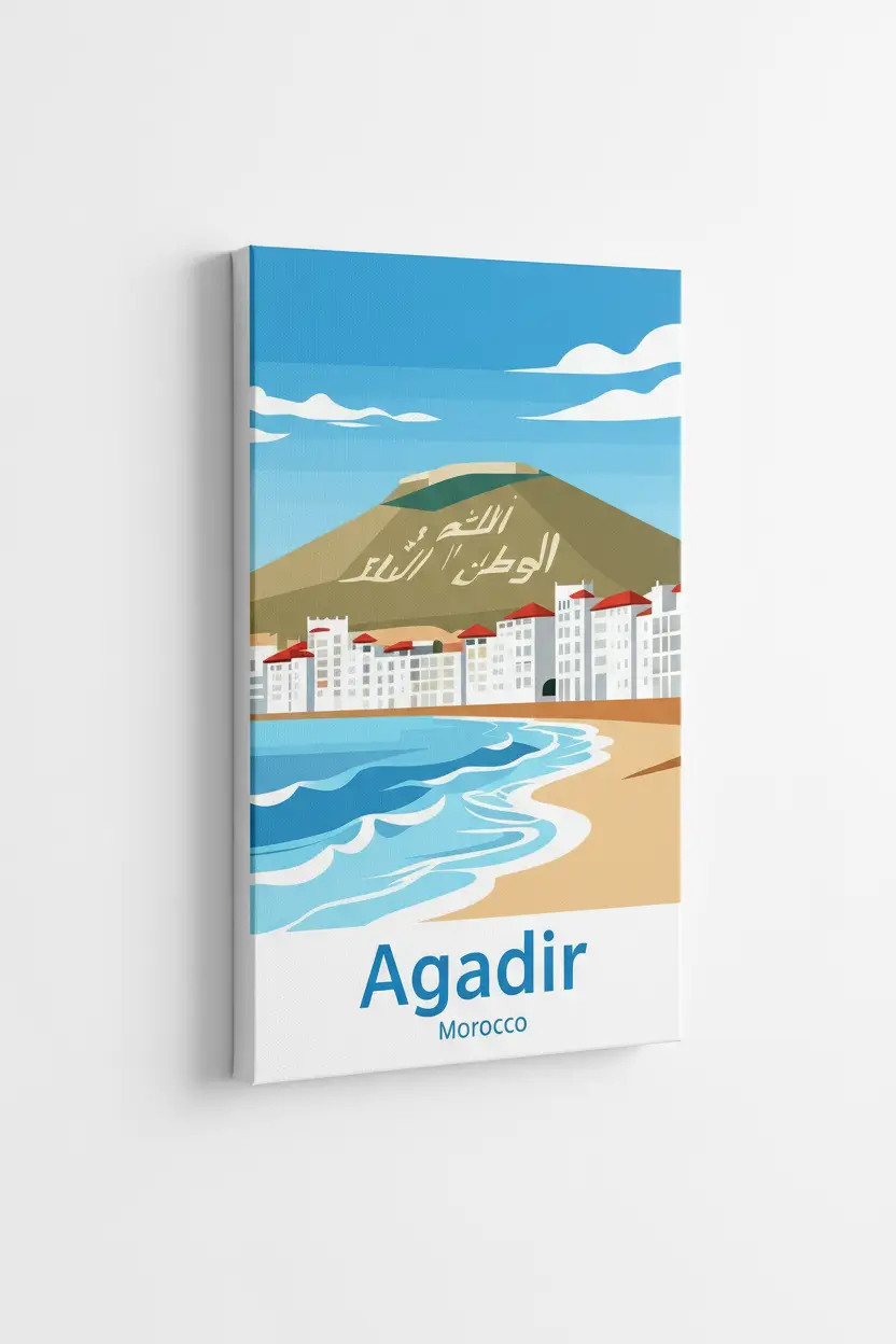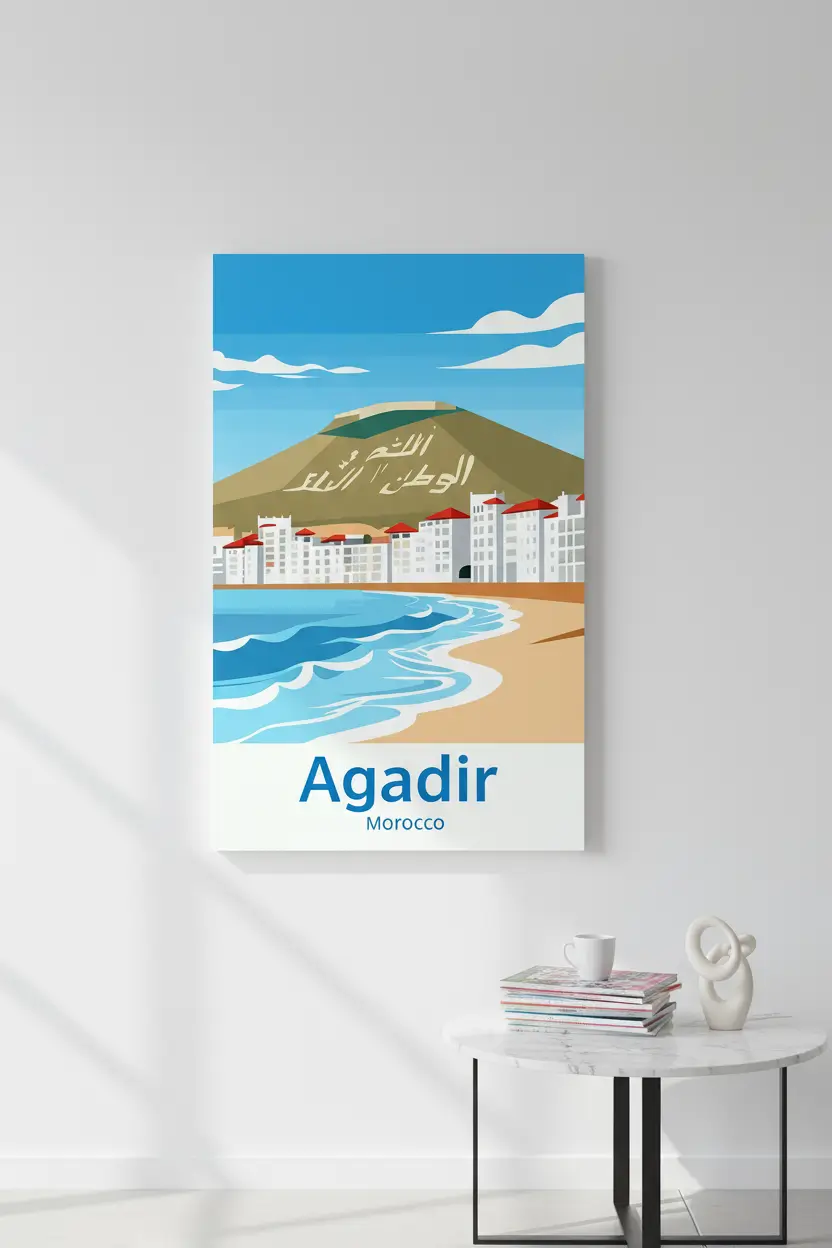 Ce tableau mural Agadir est une ode à la détente et à la mer. Inspirée par ses plages dorées, son front de mer animé et son atmosphère ensoleillée, cette affiche décorative transforme votre intérieur en une destination de voyage. Parfait pour un salon ou une chambre, il séduit les passionnés du Maroc et de la décoration murale estivale.